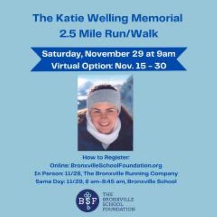 The registration fee for the in-person event will be $25 through November 28, and $30 to register the day of the event. There is no registration fee to participate virtually, but a tax-deductible contribution would be welcomed. All proceeds will benefit the Bronxville School Foundation whose mission is to enhance the quality of the education at The Bronxville School where Katie spent so many happy years.