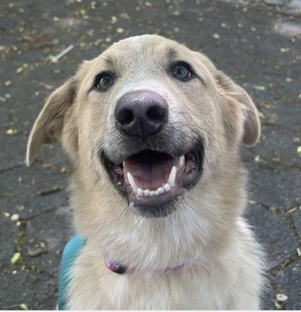 While her compatibility with cats and young children is uncertain, Lyla has never shown any aggression. She would do best with kids 12 and older due to her boundless energy, and tendency to mouth, and jump. She loves playtime, running, the outdoors, sticks, applesauce, and cuddling, but dislikes loud noises and being alone. Lyla knows how to sit and does well on a leash, and though she thrives on social interaction, she can also entertain herself.