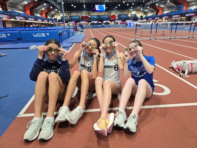 Bronxville girls’ 4x800m relay team showing off their medals at the Class C Sectional Championships. Photo by Angel Tomala-Reidel.