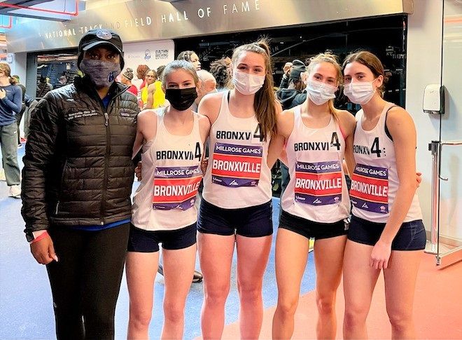 Feb. 2, 2022: During the blizzard on Saturday, two relays from the Bronxville girls’ track team headed to The Armory to compete in the 114th Millrose Games. Bronxville relay teams often qualify for this prestigious track event, but last year the Millrose Games were canceled because The Armory became a vaccination site.