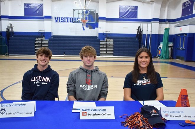 Nov. 20, 2024: Bronxville High School celebrated three of its outstanding senior athletes – Wyatt Gravier, Davis Patterson and Amy Villanueva – who announced their commitment to compete at the collegiate level during a special letter of intent signing ceremony on Nov. 13. Surrounded by administrators, teachers, family and teammates, the students were recognized for their dedication to athletics and academics.