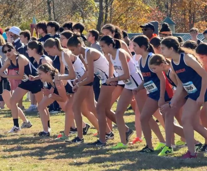 The Bronxville girls’ varsity cross country team at the start of the Westchester County Championship. Photo courtesy of @bxvxctf.