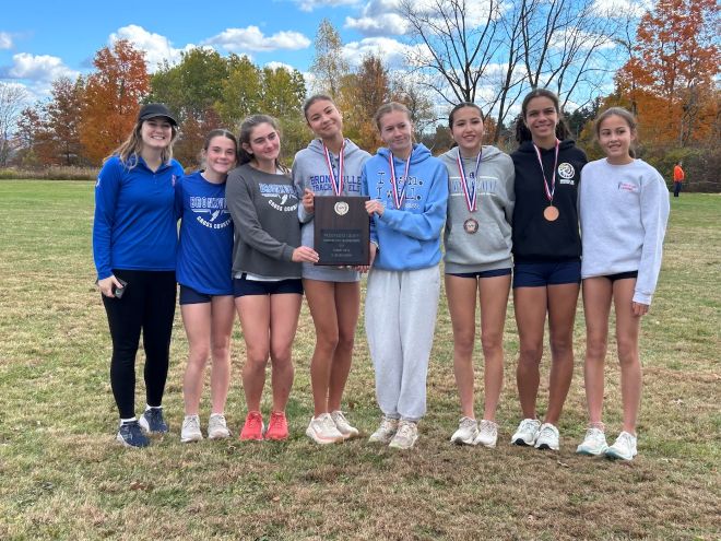 The Bronxville girls’ varsity cross country team after winning the Class C title at the Westchester County Championship. Photo courtesy of @bxvxctf.
