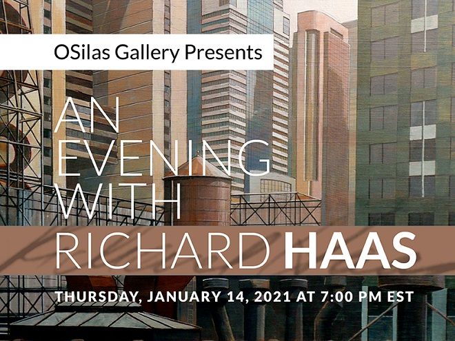Jan. 6, 2020: OSilas Gallery is pleased to present an evening talk (online) by internationally acclaimed artist Richard Haas on January 14th at 7:00 PM.