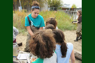 Pictured here: Victoria Garufi, director of education at Sarah Lawrence College’s Center for Urban River at Beczak, works with third-graders from St. Ann's School in Brooklyn.