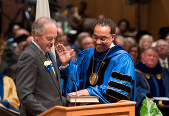 In the oath, Nunes vowed, as president, to faithfully execute his duties, support the teaching and learning of the students, act as a lawful and just authority of the college, uphold its traditions and forge new paths, and lead wisely and judiciously.