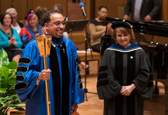 The festivities featured music by the student group Concordia College-New York GospelKnights, as well as solo performances by Monique Nunes, the new first lady of Concordia College. Deacon Valerie Webdell and Dr. Jason Thoms, dean of arts and sciences, performed Webdell’s composition "I Am About to Do a New Thing," commissioned by Dr. Nunes for his inauguration and installation.
