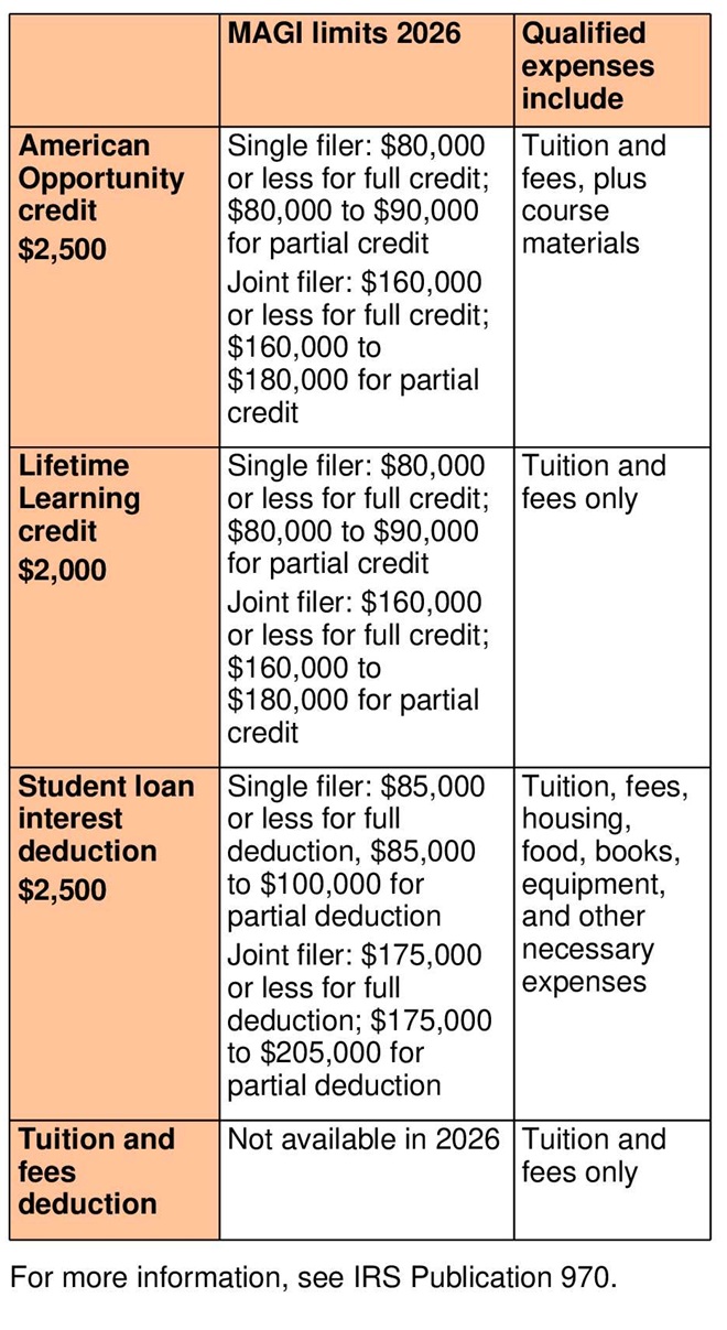 The deduction for tuition and fees is not available in 2026. It was last available in 2020, when it was worth up to $4,000 for out-of-pocket qualified tuition and fee expenses paid during the year. Single filers with a modified gross income (MAGI) of $65,000 or less and joint filers with a MAGI of $130,000 or less could take the full $4,000 deduction. A $2,000 partial deduction was available for single filers with a MAGI between $65,000 and $80,000 and joint filers with a MAGI between $130,000 and $160,000.