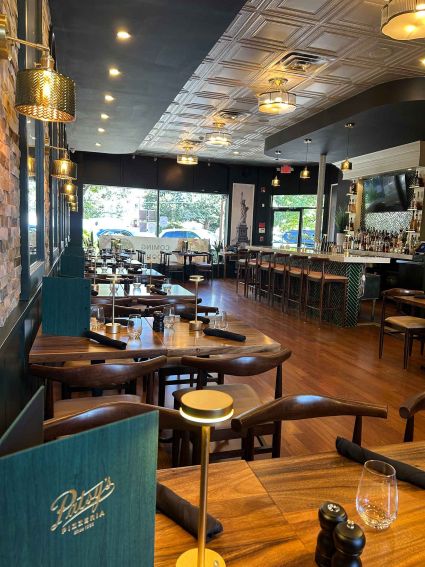 The classy-yet-casual eatery is well-suited for any occasion, whether a low-key night of pizza and burgers, a date night over shrimp scampi and pan-seared branzino, or a foodie feast on Cowboy Ribeye Steak and squid-ink linguine with jumbo lump crabmeat, bomba calabrian chilies, and breadcrumbs. Takeout has also been popular.