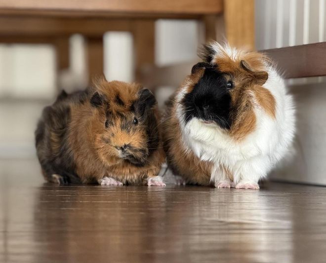 Like most guinea pigs, they may be slightly cautious at first, but they settle in with consistency and routine. Once picked up, they are relaxed and cooperative, making handling, basic grooming, and nail trims go smoothly. They like being pet and will sit next to you calmly until they get curious and find something new to explore.