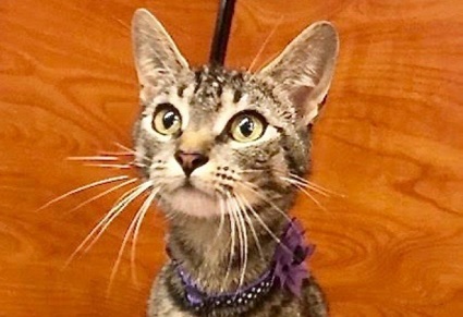 Jul. 29, 2020: Flaca is a tiny one-year-old tabby with purr-fectly symmetrical markings and sparkling yellow eyes that twinkle in the light.