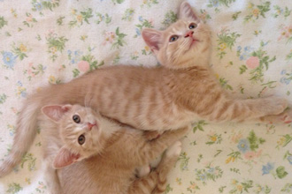 Buffy, named after his color, is playful, affectionate, and a bit more cautious than his sister. The two enjoy playing together and can often be seen leaping in unison like synchronized swimmers.