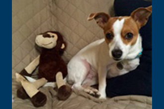 Bess is not overly vocal like many Jack Russell terriers. She will alert-bark when someone is at the door; otherwise, she is very quiet. She would do best in a home with older children because of her small size. Also, an owner who won't mind continuing her leg stretches would be ideal.