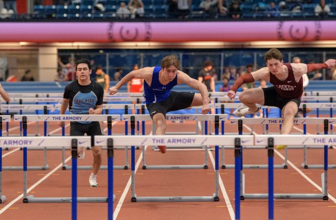 John Sekula (center) in the 55m hurdles at the Sectional Championships. Photo by Angel Tomala-Reidel.