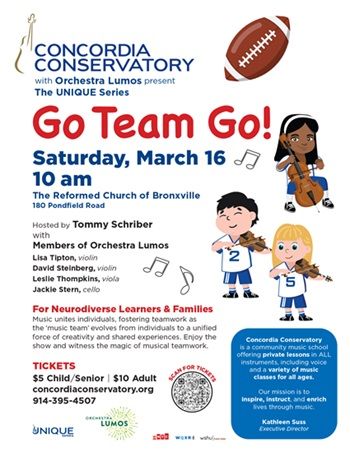 March 13, 2024: Concordia Conservatory presents its UNIQUE show “Go Team Go!” on Saturday, March 16 at three locations: The Reformed Church of Bronxville at 10 am, Concordia Conservatory located at 884 Newfield Avenue in Stamford at 1 pm, and at the New Canaan Public Library at 3 pm.