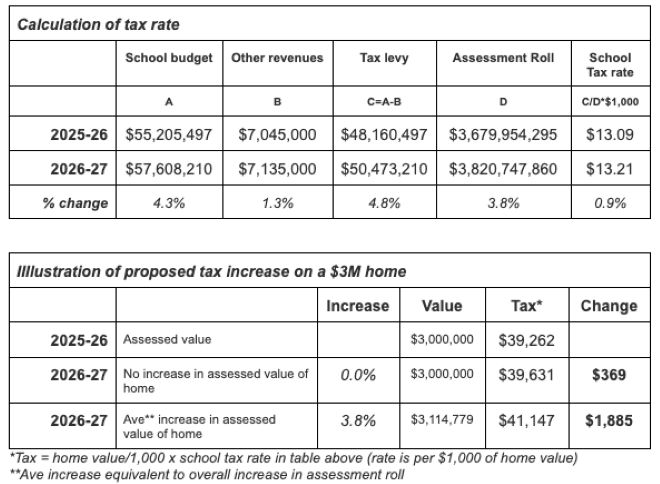 Asst. Superintendent for Business Dan Carlin presented an illustration of the tax rate calculation and impact of the proposed assessment increase on a taxpayer: