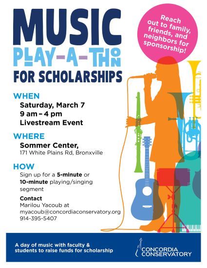 March 7, 2026, 9am - 4pm: Music Play-a-Thon for Scholarships. Livestream Event at the Sommer Center, 171 White Plains Road in Bronxville. Contact Marilou Yacoub at This email address is being protected from spambots. You need JavaScript enabled to view it.. 914-395-5407