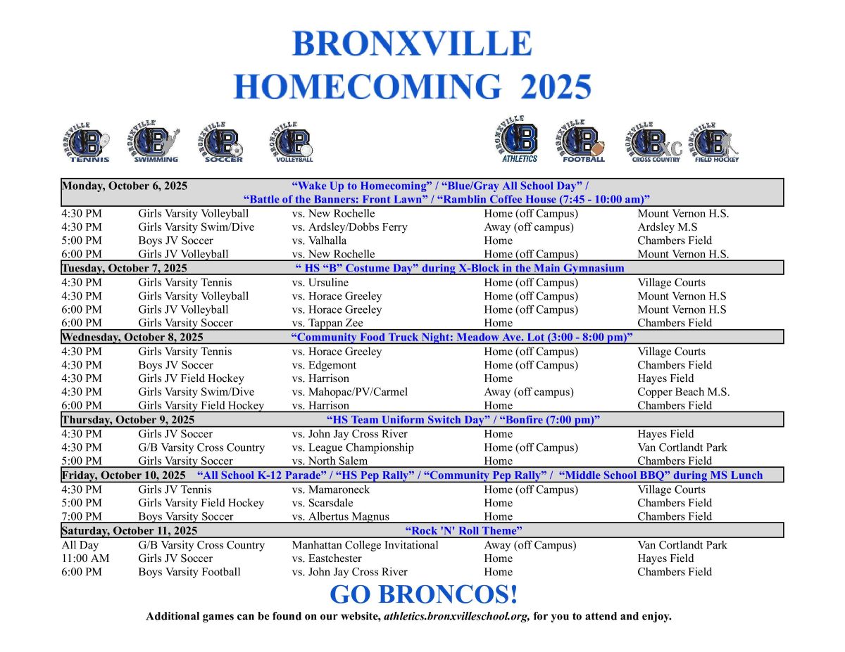 Bronxville School Homecoming Schedule of Games: October 6 - 12