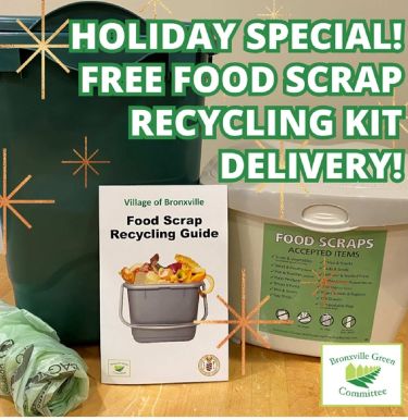 December 1 - 17: Food Scrap Recycling Kit. You can purchase this kit through the Bronxville Village website from December 1 - 17 and receive free home delivery as well as a second roll of compostable countertop bags. Order your kit here. Deliveries will be made on Fridays December 5, 12 and 19. Purchase your kit HERE.