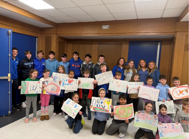 Elementary school students holding up signs for the track and field athletes as they leave for the NYS State Championship. Photo by Anthony Vaglica.