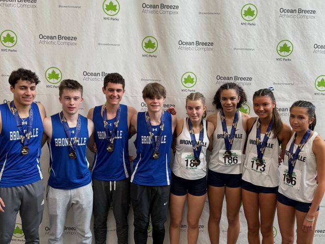 The Bronxville 4x800 relay teams win bronze medals at states: (l to r) Julian Gonzalez, Grant Patterson, Will Hogue, Matthew Jensen, Jesse O’Gorman, Ella McCalla, Carina Winiecki, and Emerson Dennis. Photo by Andrew Hogue.