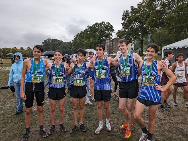 The boys’ varsity cross country team medaled at the Manhattan Invitational. Photo by J. Agnello.