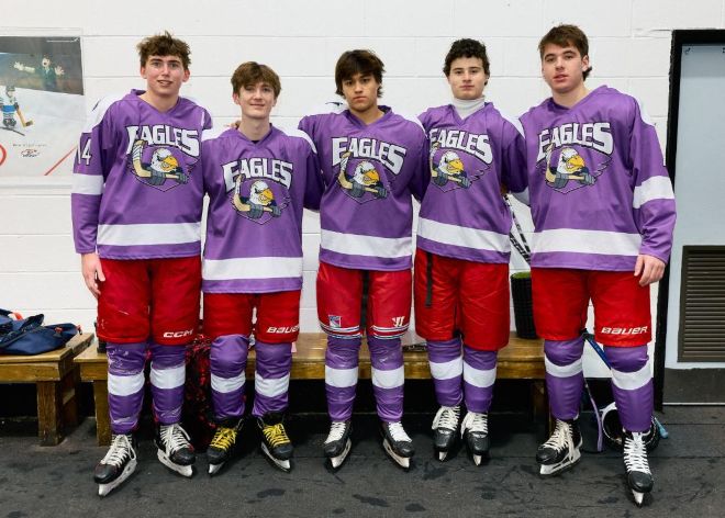 Bronxville ice hockey players supporting Hockey Fights Cancer Night (l to r): James O’Shaughnessy, Matthew Fezza, Victor Aviles, Ozzie Arrighi, and Jack O’Gorman. Photo by David Fenner.
