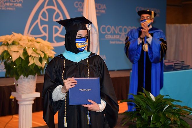 In all, 80 of Concordia’s 574 December graduates took part in the day-long event. Each had been given a time slot and the opportunity to bring up to four guests. All faced temperature checks and submitted health assessment forms before entry. President and Mrs. Nunes joined Vice President for Academic Affairs Dr. Rachel Eells and a skeleton production crew to receive the graduates as they moved through Schoenfeld Gym.