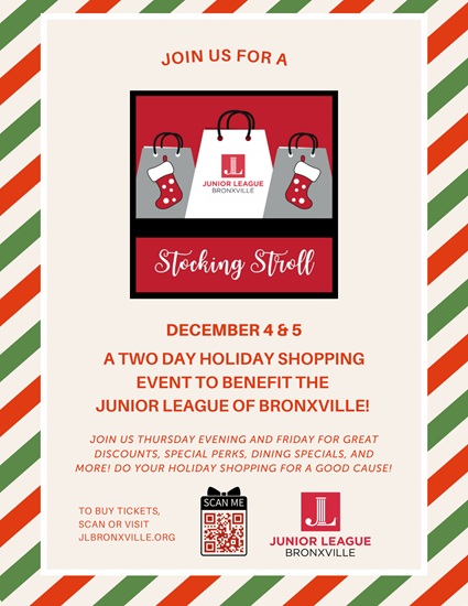 Dec. 4 & 5, 2025: Junior League Stocking Stroll. Join for great shopping discounts, special perks, dining specials, and more! Do your holiday shopping for a good cause! Buy your ticket(s) and join us for a stroll through the businesses of Bronxville. With treats, prizes, and in-store discounts for stocking holders, the Stocking Stroll is the perfect time to do your holiday shopping! Your stocking purchase supports the work of the Junior League of Bronxville in Bronxville, Eastchester, Mount Vernon, Tuckahoe and Yonkers. CLICK HERE for tickets.