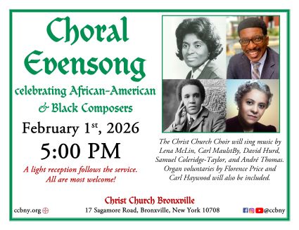 Feb. 1, 2026, 5:00PM: Choral Evensong celebrating African-American & Black Composers. A light reception will follow. Christ Church Bronxville, 17 Sagamore Road.