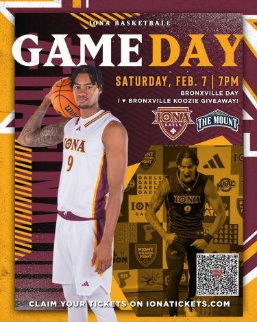 Feb. 7, 2026, 7:00PM: Bronxville Community Night at Iona Men's Basketball. Hynes Athletics Center, 715 North Ave, New Rochelle, NY, 10801 Iona University is proud to celebrate Bronxville Community Night during its men's basketball game! Join us as the Maroon & Gold take on Mount St. Mary's! Receive a free "I ❤️ Bronxville Koozie" while supplies last! Visit ionatickets.com and use code BRONXVILLE to claim up to 6 free tickets!
