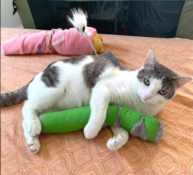 This funny fellow will tolerate other cats in the house but does like to attempt surprise pounces on them, so he would also be fine as your one and only if you have a kitty that doesn't enjoy playful antics.