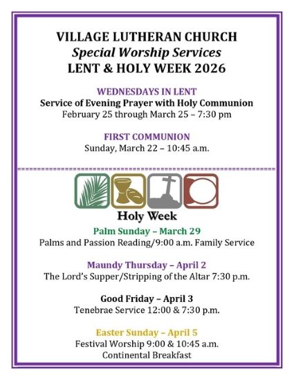 The Village Lutheran Church “is a ministry of word and sacraments. This ministry gives opportunities for witness, nurture, fellowship, stewardship and service.” The Chapel School, which goes from pre-school three-year olds through 8th grade, is an integral part of the Church’s ministry for children.