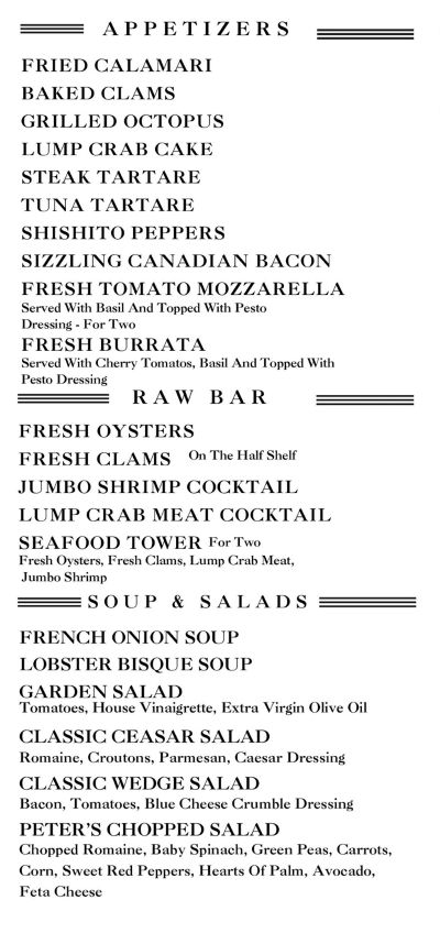 Their delicious menu is below and has something for everyone - - Raw Bar, Soups & Salads, Delicious Sides, Steaks & Chops, Seafood,, and many other Entrees,