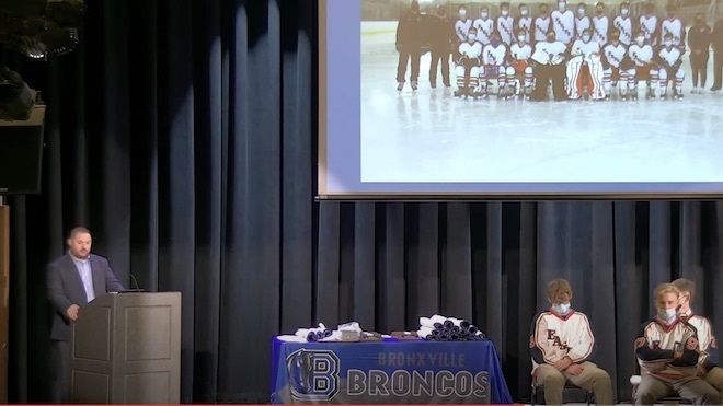 Apr. 21, 2021: Athletic Council Presidents Kaitlin McBride and Connor Randall hosted the annual winter sports awards introducing the winter athletes and their coaches. It was a live event that was videotaped in the high school auditorium and can be seen on the Bronxville YouTube Channel here.