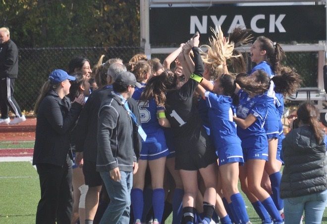 The Bronxville girls’ soccer team celebrates its Class B Sectional Championship. Photo by J. Murrer.