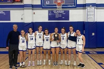 Bronxville girls’ basketball team with the Bill Green tournament plaque. Photo courtesy of @BXVGirlsHoops.