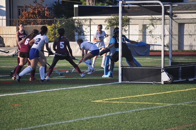 The girls’ field hockey team in a game against Albertus Magnus during Homecoming Week. Photo by J. Murrer.